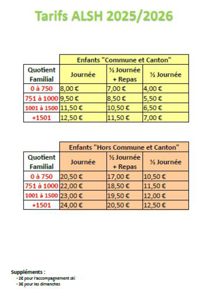 | Quotient Familial CAF | Journée | Demi journée + repas | Demi journée |